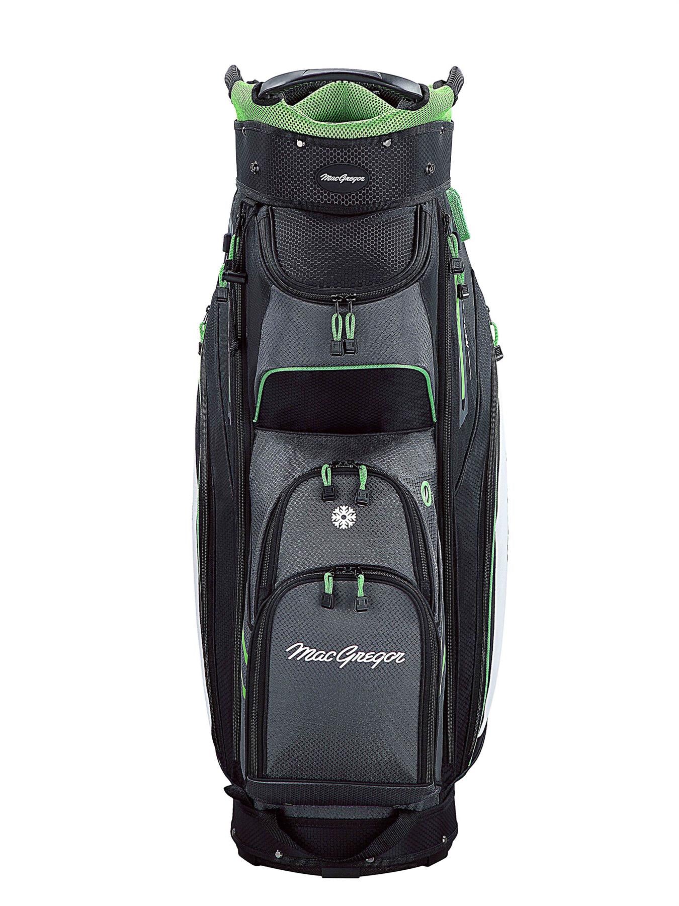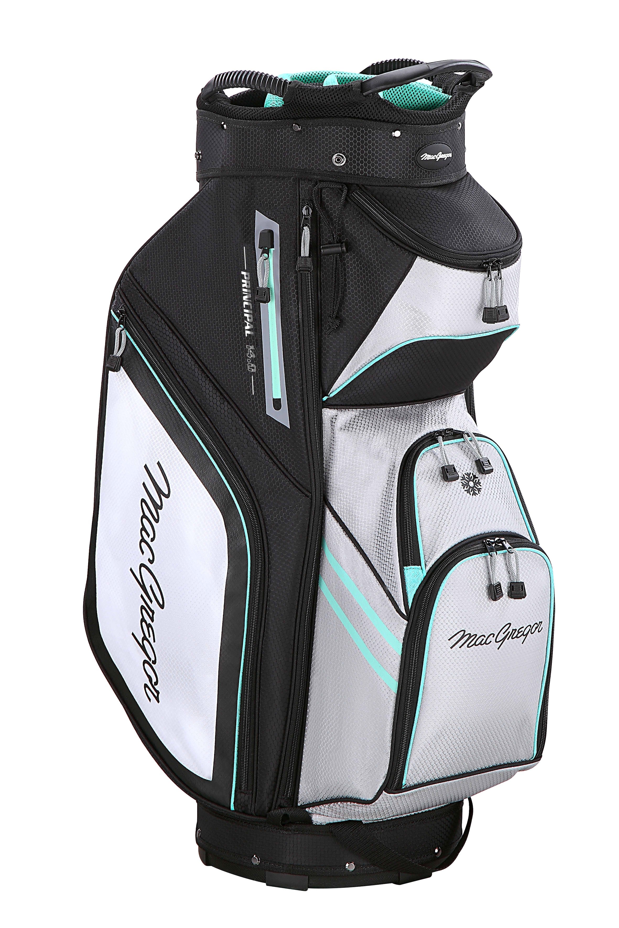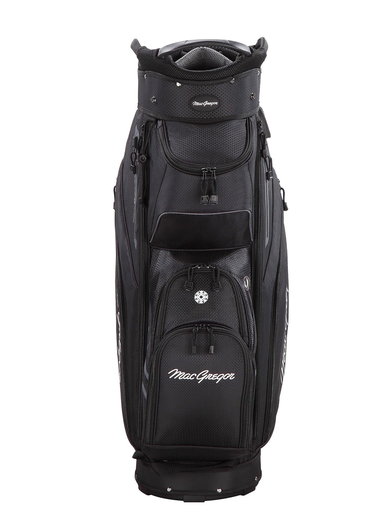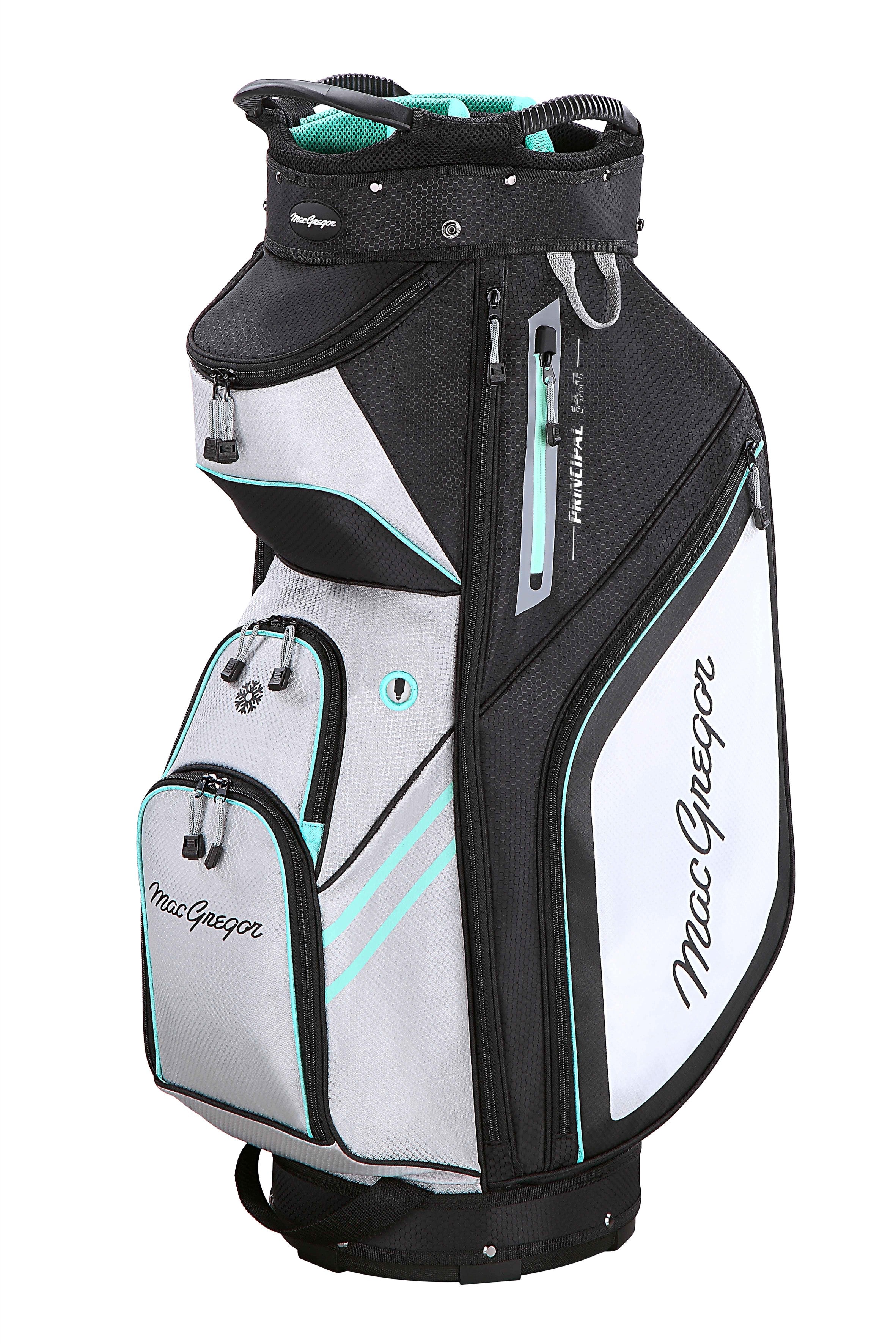 The best cart bags should give a golfer a place for everything, and this fantastic addition to the MacGregor range does that with space to spare. A 10", 14-way top with 3 integrated grab handles combines with 3 full length dividers to make the organization of clubs a breeze. With 9 strategically placed pockets including seamless velour-lined valuable pocket, even the best equipped golfer will have a spot for everything, while the design of all pockets being forward facing, simplifies access and makes every pocket useful. Neat features such as umbrella loop. Pen holder, extra-large travel and rain hood and a padded shoulder strap complete the functionality. 3 stylish colour combinations and the iconic MacGregor logo as sported by Major winners through the years mean this superb cart bag looks as great as it plays.